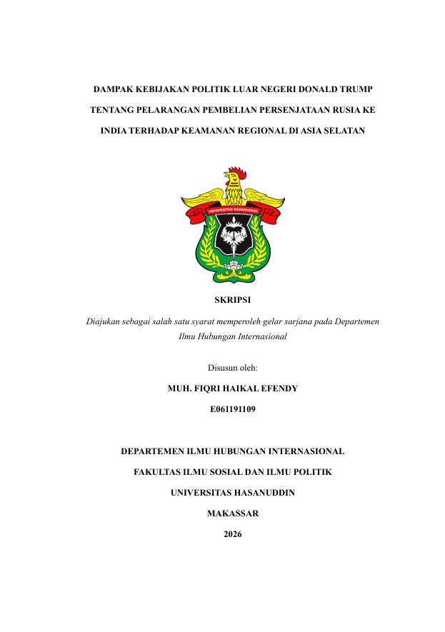 EFENDY, MUH. FIQRI HAIKAL (2026) Dampak Kebijakan Politik Luar Negeri Donald Trump Tentang Pelarangan Pembelian Persenjataan Rusia Ke India Terhadap Keamanan Regional Di Asia Selatan = The Impact of Donald Trump's Foreign Policy Regarding the Ban on Russian Arms Purchases to India on Regional Security in South Asia. Skripsi thesis, Universitas Hasanuddin.