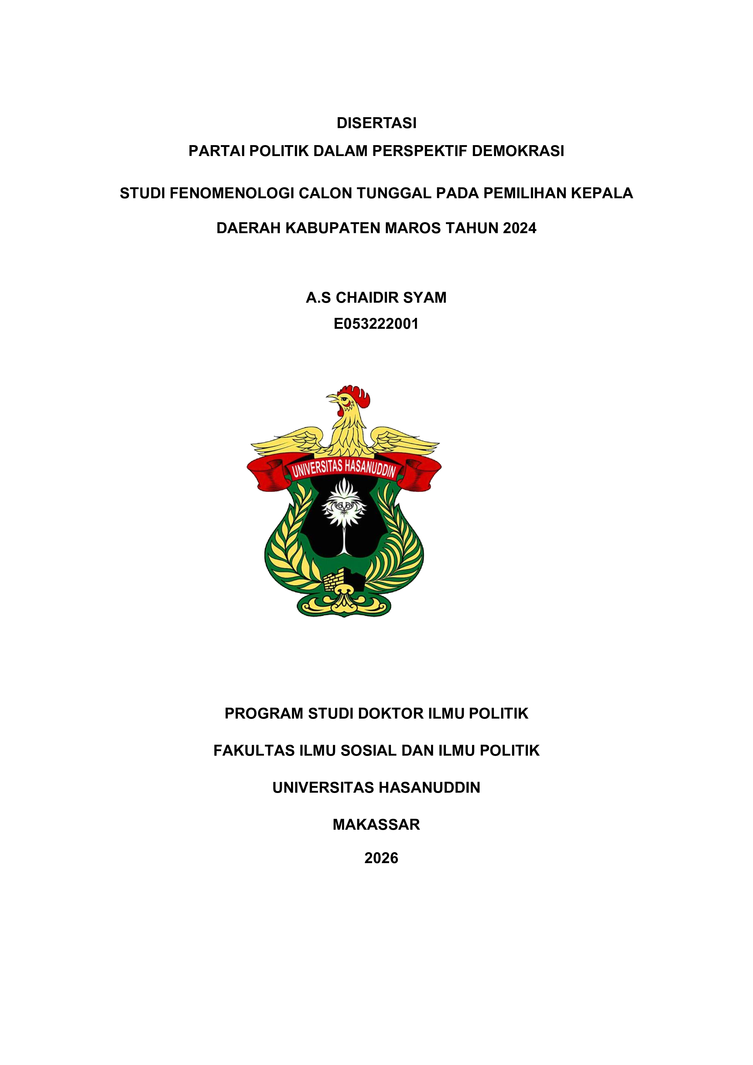 A.S Chaidir Syam, Partai Politik Dalam Perspektif Demokrasi Studi Fenomenologi Calon Tunggal Pada Pemilihan Kepala Daerah Kabupaten Maros Tahun 2024 (Dibimbing oleh Prof. Dr. Armin Arsyad, M.Si, Prof. Dr. Gustiana A. Kambo, M.Si & Dr. Andi Lukman Irwan, M.Si) Penelitian ini berangkat dari fenomena munculnya calon tunggal dalam Pemilihan Kepala Daerah Kabupaten Maros 2024, yang menandai absennya kompetisi elektoral dalam politik lokal. Kondisi ini tidak semata akibat tingginya elektabilitas petahana, melainkan hasil konfigurasi kekuasaan yang terstruktur melalui dominasi sumber daya politik, konsolidasi partai, serta relasi kuasa dengan aparatur pemerintahan dan elite lokal. Penelitian bertujuan mengkaji faktor penyebab calon tunggal, menganalisis relasi kuasa antara pasangan calon dan partai pengusung, serta menilai implikasinya terhadap kualitas demokrasi lokal. Metode yang digunakan adalah kualitatif dengan pendekatan studi kasus single case–multi analysis. Data diperoleh melalui wawancara mendalam dengan aktor politik, elite partai, penyelenggara pemilu, tokoh masyarakat, dan pemilih, serta diperkuat observasi lapangan dan dokumentasi. Analisis dilakukan melalui pengkodean, pengembangan tema, dan pengelompokan temuan ke dalam kluster teori. Hasil penelitian menunjukkan tiga temuan utama. Pertama, dominasi modal politik petahana berupa penguasaan jaringan partai, aparatur daerah, dan dukungan elite menutup ruang kompetisi sejak tahap pencalonan. Kedua, relasi kuasa antara calon dan partai bersifat asimetris dan akomodatif; partai memilih koalisi besar untuk meminimalkan risiko elektoral, bukan sebagai arena rekrutmen politik. Ketiga, fenomena calon tunggal mempersempit kualitas demokrasi lokal, ditandai terbatasnya pilihan pemilih, partisipasi yang mudah diarahkan, lemahnya fungsi kolom kosong, serta menurunnya mekanisme pengawasan. Secara teoretik, penelitian ini memperkuat relevansi teori modal politik, pilihan rasional, patron–klien, dan demokrasi substantif. Konseptualnya, calon tunggal bukan anomali elektoral, melainkan produk interaksi struktur kekuasaan, rasionalitas elite, dan pelemahan demokrasi substantif dalam politik lokal Indonesia.