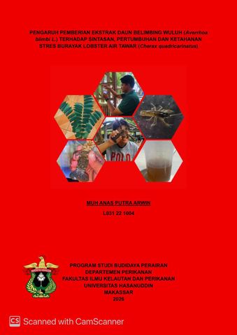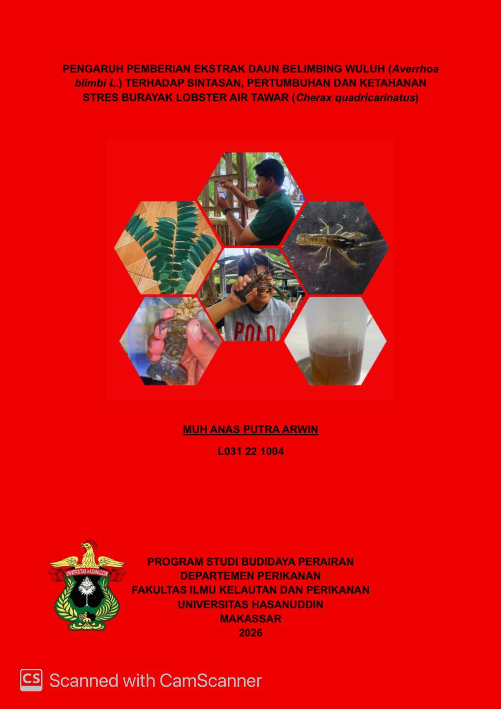 ARWIN, MUH ANAS PUTRA (2026) PENGARUH PEMBERIAN EKSTRAK DAUN BELIMBING WULUH (Averrhoa blimbi L.) TERHADAP SINTASAN, PERTUMBUHAN DAN KETAHANAN STRES BURAYAK LOBSTER AIR TAWAR (Cherax quadricarinatus) = The Effect of Bilimbi Leaf (Averrhoa blimbi L.) Extract on the Survival, Growth, and Stress Resistance of Freshwater Crayfish Fry (Cherax quadricarinatus). Skripsi thesis, Universitas Hasanuddin.