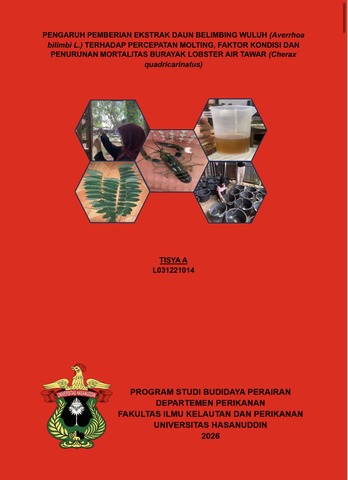 A, TISYA (2026) PENGARUH PEMBERIAN EKSTRAK DAUN BELIMBING WULUH (Averrhoa bilimbi L.) TERHADAP PERCEPATAN MOLTING, FAKTOR KONDISI DAN PENURUNAN MORTALITAS BURAYAK LOBSTER AIR TAWAR (Cherax quadricarinatus) = THE EFFECT OF BILIMBI LEAF EXTRACT (Averrhoa bilimbi L) ON MOULTING RATE, CONDITION FACTOR AND MORTALITY REDUCTION OF FRESH WATER CRAYFISH (Cherax quadricarinatus). Skripsi thesis, Universitas Hasanuddin.