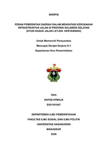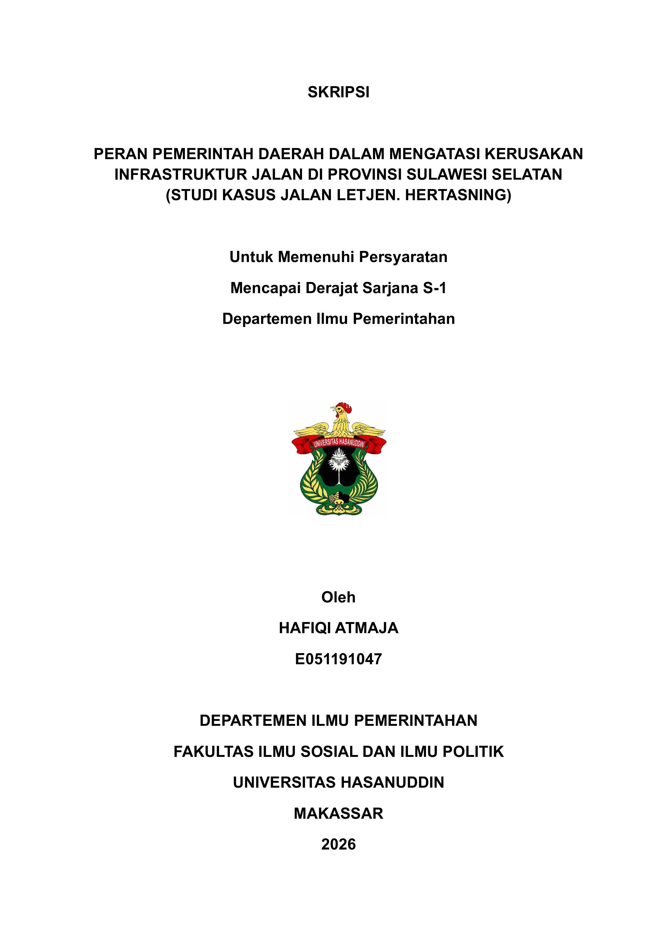 HAFIQI ATMAJA, Nomor Induk Mahasiswa E051191047, Program Studi Ilmu Pemerintahan, Fakultas Ilmu Sosial dan Ilmu Politik, Universitas Hasanuddin. Menyusun skripsi dengan judul ”PERAN PEMERINTAH DAERAH DALAM MENGATASI KERUSAKAN INFRASTRUKTUR JALAN DI PROVINSI SULAWESI SELATAN (STUDI KASUS JALAN LETJEN. HERTASNING)” di bawah bimbingan Prof. Dr. Hj. Rabina Yunus, M. Si. sebagai Dosen Pembimbing Tugas Akhir. Penelitian ini bertujuan untuk mengidentifikasi dan menganalisis faktor-faktor yang memengaruhi terjadinya kerusakan jalan provinsi di Sulawesi Selatan, mengkaji dampaknya terhadap aktivitas sosial masyarakat, serta menjelaskan peran dan langkah strategis pemerintah daerah dalam mengatasinya. Penelitian ini menggunakan pendekatan deskriptif kualitatif. Teknik pengumpulan data dilakukan melalui wawancara mendalam dengan pihak Dinas Bina Marga dan Bina Konstruksi Provinsi Sulawesi Selatan selaku instansi yang bertanggung jawab, observasi lapangan, serta dokumentasi. Analisis data dilakukan melalui tahapan pengumpulan data, reduksi data, penyajian data, dan penarikan kesimpulan. Hasil penelitian menunjukkan bahwa kerusakan ruas Jalan Letjen. Hertasning – Aroepala – Tun Abdul Razak dipengaruhi oleh tingginya volume dan beban lalu lintas, usia layanan jalan, serta keterbatasan anggaran pemeliharaan. Kerusakan tersebut berdampak signifikan terhadap mobilitas dan aktivitas pengguna jalan, meningkatkan risiko kecelakaan, serta membentuk persepsi negatif masyarakat terhadap kinerja pemerintah daerah dalam penyelenggaraan pelayanan publik, khususnya pengelolaan infrastruktur jalan. Dalam penanganannya, Pemerintah Provinsi Sulawesi Selatan melaksanakan fungsi perencanaan, pelaksanaan, dan pengawasan melalui program preservasi jalan dengan skema kontrak tahun jamak (multiyears). Meskipun demikian, keterbatasan fiskal dan kendala teknis di lapangan masih memengaruhi efektivitas penanganan.