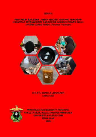 UMAKAAPA, SITI AYU SHABILA (2026) PENGARUH SUPLEMEN LIMBAH JEROAN TERIPANG TERHADAP KUANTITAS SPERMATOZOA DAN INDEKS GONADOSOMATIK INDUK JANTAN UDANG WINDU (Penaeus Monodon) = EFFECT OF SEA CUCUMBER VISCERA WASTE SUPPLEMENTATION ON SPERMATOZOA QUANTITY AND GONADOSOMATIC INDEX OF MALE BLACKTIGER SHRIMP (Penaeus Monodon). Skripsi thesis, Universitas Hasanuddin.