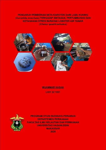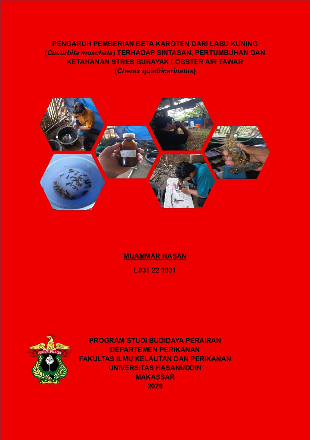 HASAN, MUAMMAR (2026) Pengaruh Pemberian Beta Karoten dari Labu Kuning (Cucurbita moschata) terhadap Sintasan, Pertumbuhan, dan Ketahanan Stres Burayak Lobster Air Tawar (Cherax quadricarinatus) = The Effect of Beta-Carotene from Pumpkin (Cucurbita moschata) on Survival, Growth, and Stress Resistance of Freshwater Crayfish Larvae (Cherax quadricarinatus). Skripsi thesis, Universitas Hasanuddin.
