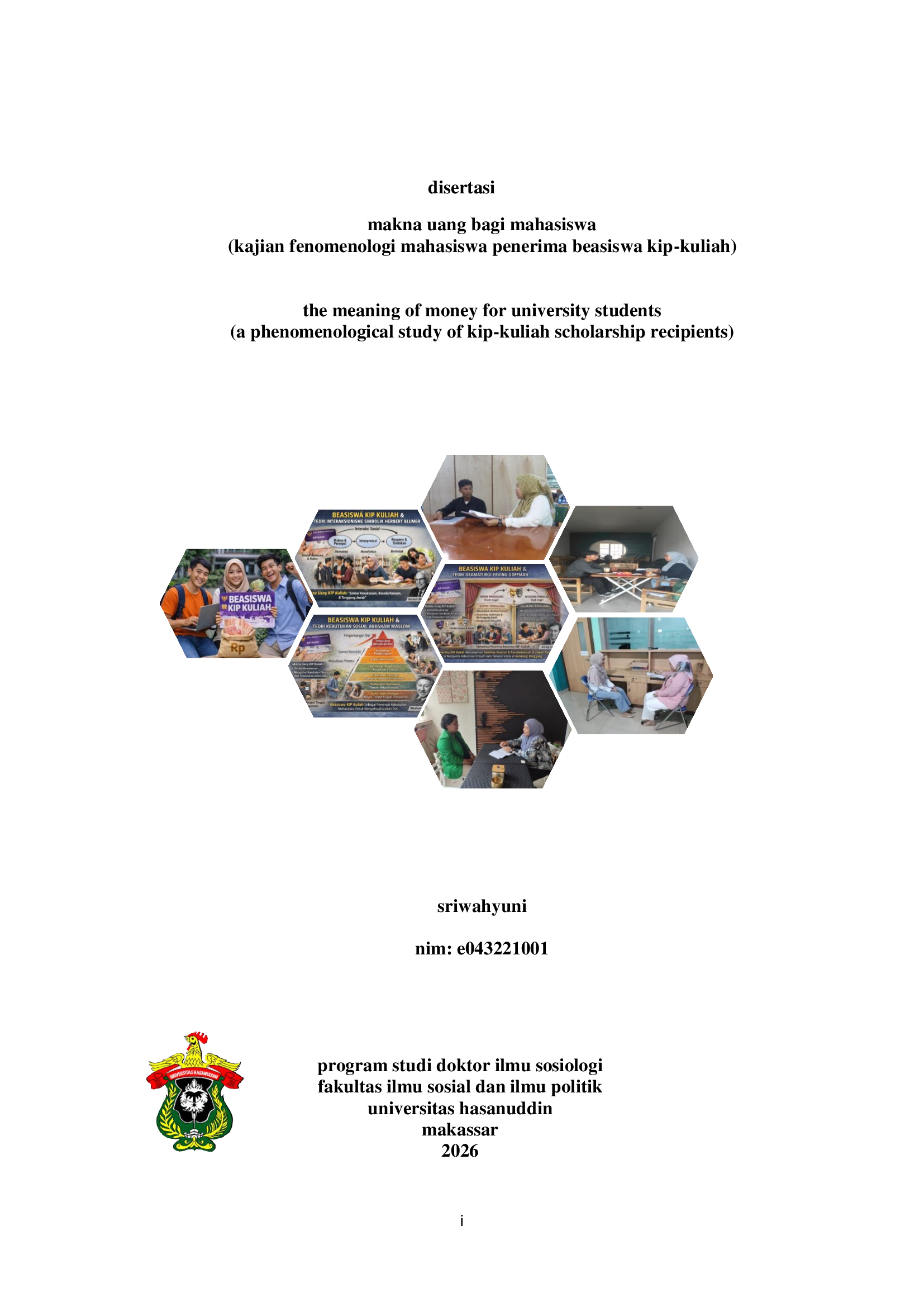 SRIWAHYUNI, SRIWAHYUNI (2026) MAKNA UANG BAGI MAHASISWA (Kajian Fenomenologi Mahasiswa Penerima Beasiswa KIP-Kuliah) = THE MEANING OF MONEY FOR UNIVERSITY STUDENTS (A Phenomenological Study Of KIP-Kuliah Scholarship Recipients). Disertasi thesis, Universitas Hasanuddin.