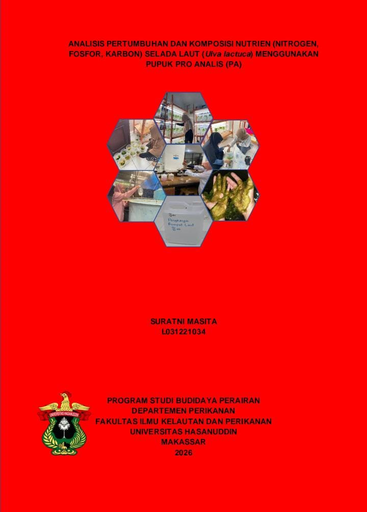 MASITA, SURATNI (2026) ANALISIS PERTUMBUHAN DAN KOMPOSISI NUTRIEN (NITROGEN, FOSFOR, KARBON) SELADA LAUT (Ulva lactuca) MENGGUNAKAN PUPUK PRO ANALIS (PA) = ANALYSIS OF GROWTH AND NUTRIENT COMPOSITION (NITROGEN, PHOSPHORUS, CARBON) OF SEA LESS (Ulva lactuca) USING PRO ANALYSIS (PA) FERTILIZER. Skripsi thesis, Universitas Hasanuddin.