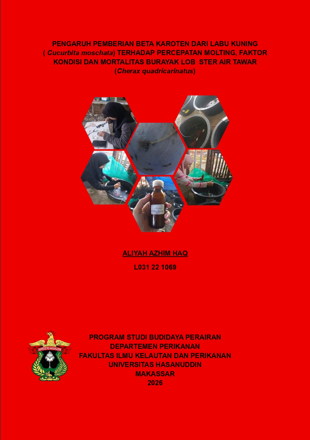 HAQ, ALIYAH AZHIM (2026) Pengaruh Pemberian Beta Karoten dari Labu Kuning (Cucurbita moschata) Terhadap Percepatan Molting, Faktor Kondisi dan Mortalitas Burayak Lobster Air Tawar = The Effect of Beta Carotene Extract from Pumpkin (Cucurbita moschata) on Molting Rate, Condition Factor and Mortality of Freshwater Crayfish Juveniles (Cherax quadricarinatus). Skripsi thesis, Universitas Hasanuddin.