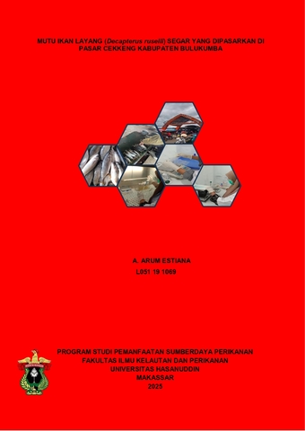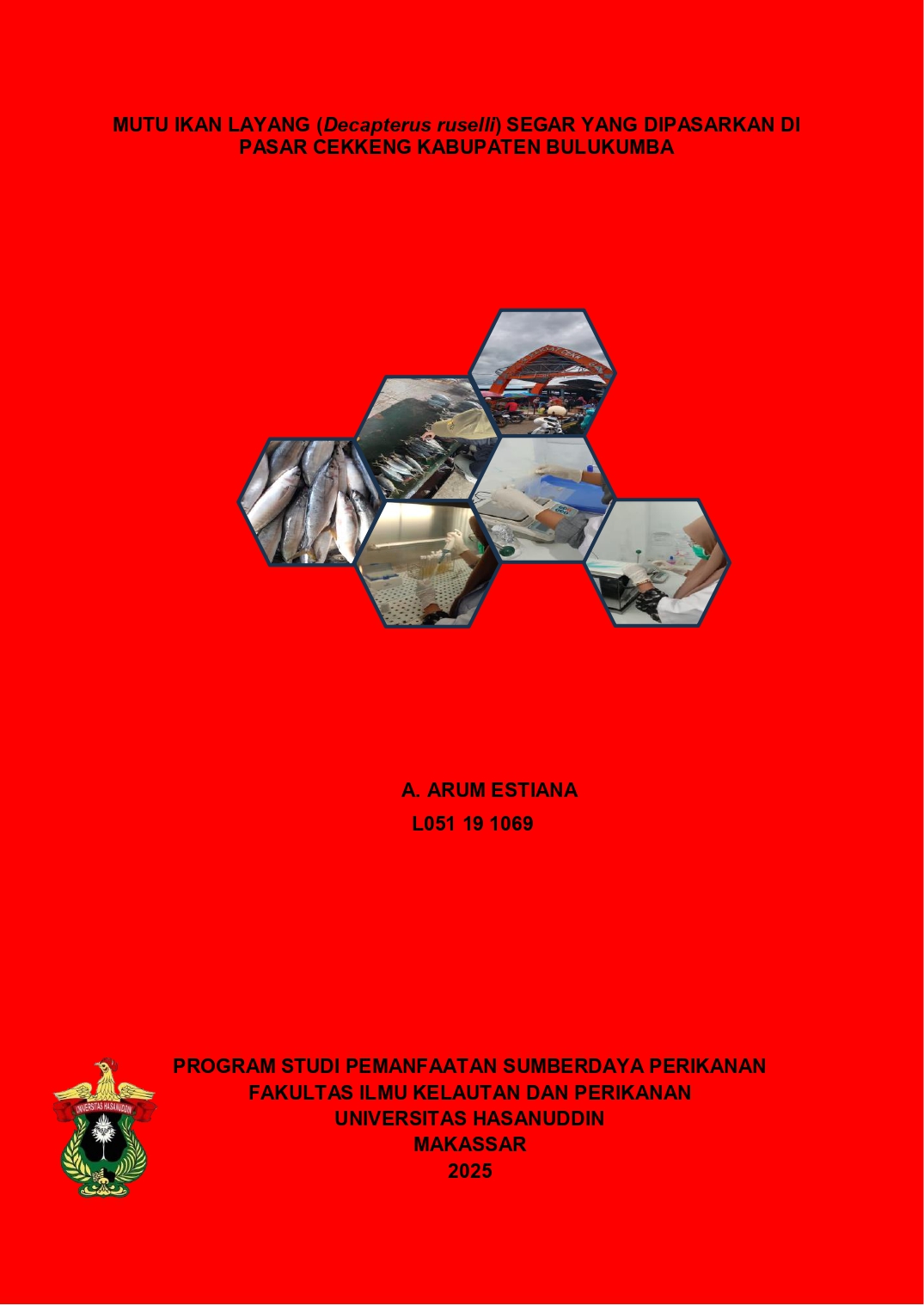 ABSTRAK A. Arum Estiana. L051191069. “Mutu Ikan Layang (Decapterus ruselli) Segar Yang Dipasarkan Di Pasar Cekkeng Kabupaten Bulukumba”. (Dibimbing oleh Fahrul sebagai Pembimbing Utama dan Syahrul sebagai Pembimbing Anggota). Latar belakang: Kabupaten Bulukumba adalah salah satu kabupaten di Provinsi Sulawesi Selatan yang memiliki potensi laut dan pesisir yang dapat diandalkan sebagai Pendapatan Asli Daerah (PAD) karena menempati posisi pertama untuk produksi perikanan tangkap di Sulawesi Selatan dengan hasil produksi 53.951 Ton pada tahun 2017(KKP,2018) dan pada tahun 2022 triwulan II mencapai 15.499,2 Ton dan 11.819.118,19 – ton pada triwulan II tahun 2024 untuk berbagai jenis komoditas ikan. Tujuan: Penelitian ini bertujuan untuk menentukan mutu ikan layang segar yang dipasarkan di Pasar Cekkeng Kabupaten Bulukumba berdasarkan parameter mikrobiologi dan mutu fisik. Metode: Penelitian dilaksanakan pada bulan November–Desember 2025 dengan metode studi kasus. Pengambilan sampel dilakukan dua kali dalam seminggu selama dua pekan pada pukul 06.00 dan 12.00 WITA. Parameter yang diuji meliputi Angka Lempeng Total (ALT), coliform, organoleptik, suhu, dan pH. Analisis data dilakukan secara deskriptif dan dibandingkan dengan standar mutu SNI. Hasil: penelitian menunjukkan bahwa nilai rata-rata ALT ikan layang berkisar antara 1,25 × 10⁴ hingga 1,9 × 10⁵ koloni/g dan masih berada di bawah batas maksimum SNI 2332.3:2015. Nilai coliform berada pada kisaran <3,0 APM/g sesuai dengan SNI 2332.1:2015. Nilai organoleptik berada pada rentang 7–9, suhu berkisar antara 10,6–13,8°C, dan pH berkisar antara 6,13–6,73. Kesimpulan: Berdasarkan hasil tersebut, ikan layang yang dipasarkan di Pasar Cekkeng Kota Bulukumba masih tergolong segar dan aman dikonsumsi, namun diperlukan perbaikan penanganan terutama pada penerapan rantai dingin untuk mempertahankan mutu ikan lebih optimal. Kata Kunci: Ikan Layang, Mutu Mikrobiologi,Rantai Dingin, Pasar Cekkeng.